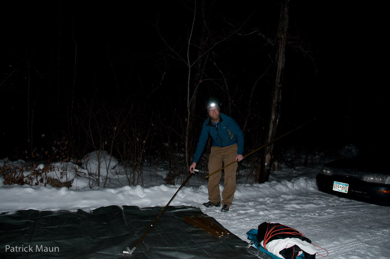 Ian and I set up camp in the side of the road, after driving backwards for three or four miles. Turning a car with bald tires around on a narrow unplowed dirt road proved tough.