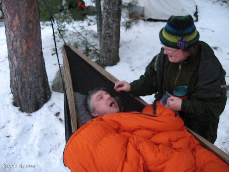 Camping is exhausting work. Bill gets fed like a young helpless bird.